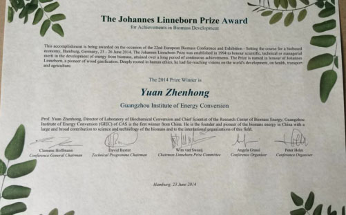 袁振宏研究员在德国汉堡举办的第22届欧洲生物质能大会(EUBC&E 2014)上荣获“林内伯恩奖”(LinnebornPize)。作为亚洲首位获此殊荣的生物质能科学家,大奖评委会评价袁振宏研究员是中国现代生物质能源的主要推动者和开拓者之一,为生物质能源在国际领域的科学技术发展做出了杰出贡献。